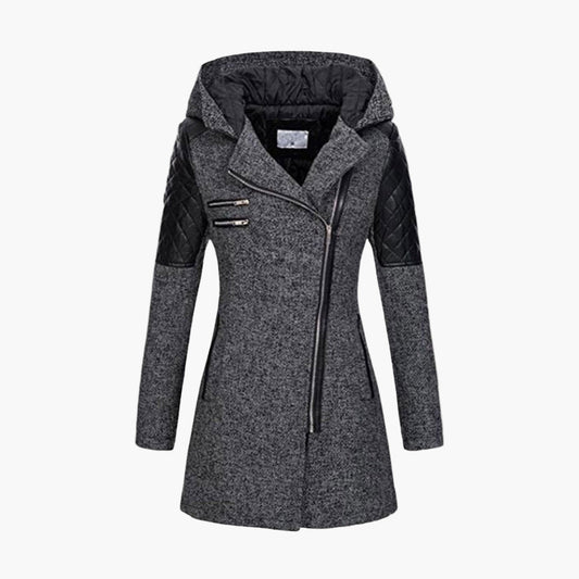 Women's Hooded Tweed Coat with Faux Leather Trim – Elegant Winter Outerwear