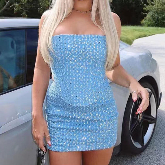 Anna – Denim Sequin Skirt Suit with Tube Top