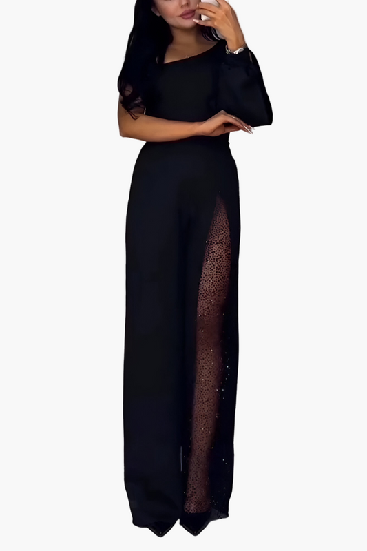 Women's Elegant One-Shoulder Wide Leg Jumpsuit with Sheer Panel – Modern Party & Evening Wear